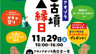 お知らせ 「アヤノアオゾラ●古墳▲縁日」&「アヤノアオゾラさんぽ」開催! アヤノアオゾラ商店会では、古墳やはにわのお祭り「堺古墳祭り」とコラボした秋のイベント「アヤノアオゾラ●古墳▲縁日」を、11月29日(土)10:00~16:00に開催します。同時に、商店街を歩いてクイズを解きながら楽しむ「アヤノアオゾラさんぽ... 2025.11.19 お知らせイベント